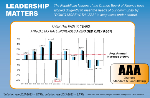 This didn’t happen by accident. Sound town management and fiscal planning by our First Selectman and his Republican team has enabled us to achieve many objectives for the people of Orange. Add to that a strong spirit of volunteerism, and you have a formula for success.